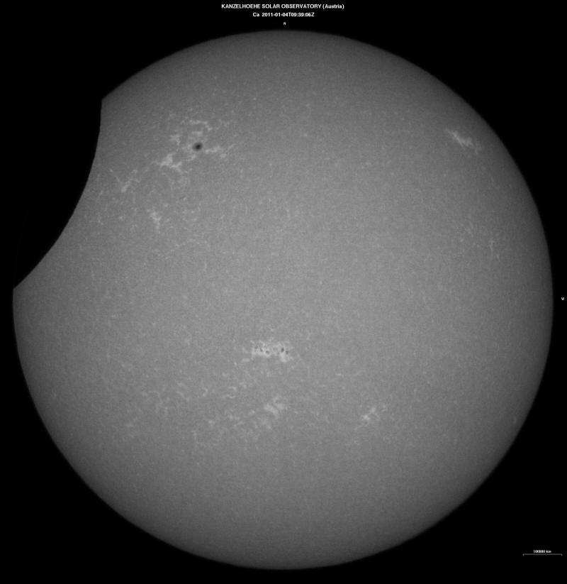 Qualcuno, più fortunato di noi, però ce l'ha fatta. Ecco qui di seguito una foto scattata all'Osservatorio di Kanzelhohe in Austria, che mostra la Luna mentre sta lasciando il disco: siamo quindi nella fase terminale dell'oscuramento del Sole (ore 09:39 TU. Il massimo della copertura si è avuto invece alle 08:13 TU per la nostra latitudine). L'immagine è stata ripresa nella riga K II del Calcio, che mette bene in evidenza anche gruppi di macchie e facole: